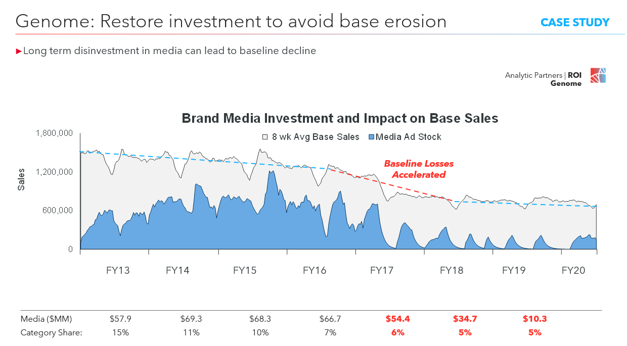 In categories like apparel retail, data (below) shows the impact clearly: a drop in brand media leads to a slow but steady slide in baseline performance - and the road to recovery is long and expensive.