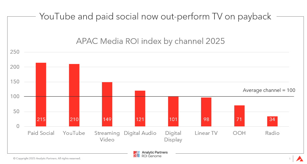 Analytic Partners’ analysis of 850+ businesses and hundreds of millions in ad spend shows the balance has flipped. Paid Social leads with a 215 ROI index, YouTube follows at 210, Streaming Video sits at 149 — while Linear TV lags at 98. Digital Audio (121) and Display (101) also outperform TV, while OOH (71) and Radio (34) trail further behind. There’s a clear opportunity for marketers to look at what mix they have.